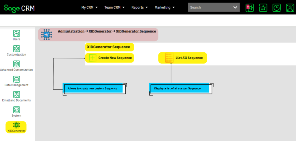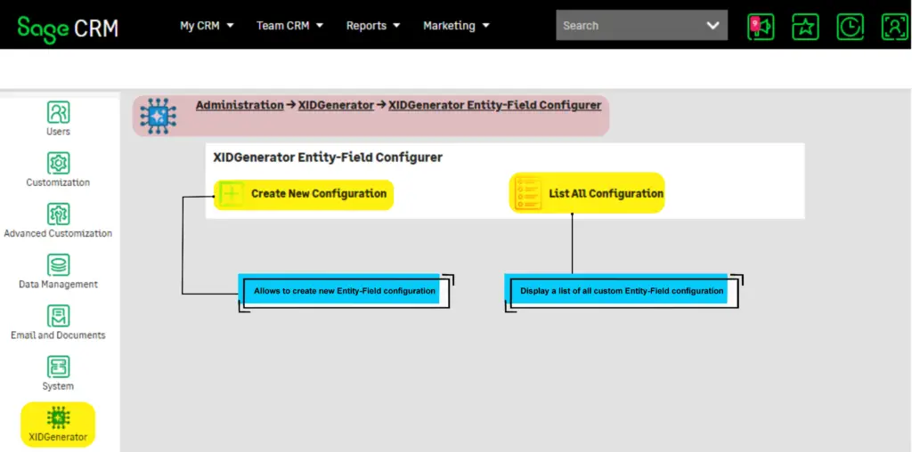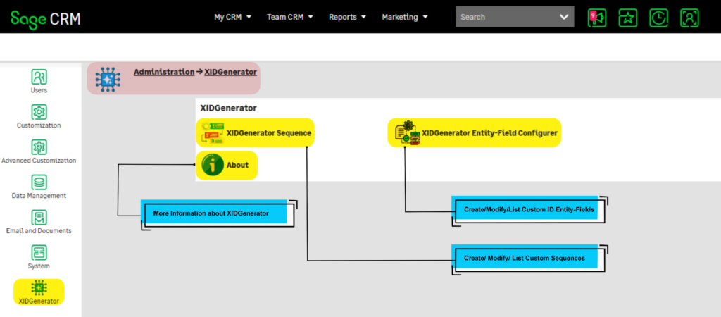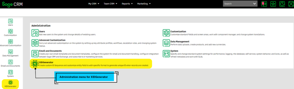 This screen shows how XIDGenerator is accessed from the Administration section of Sage CRM.